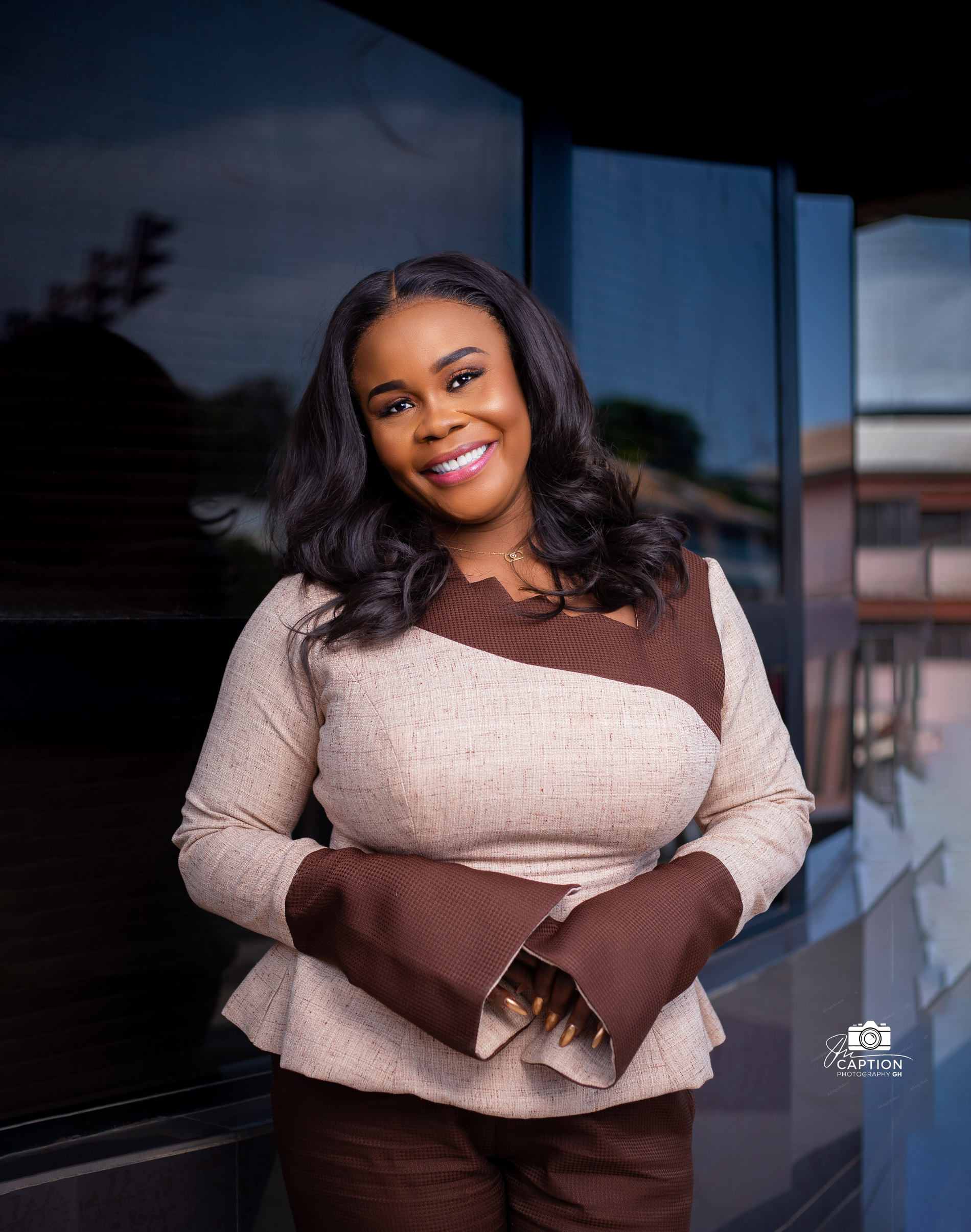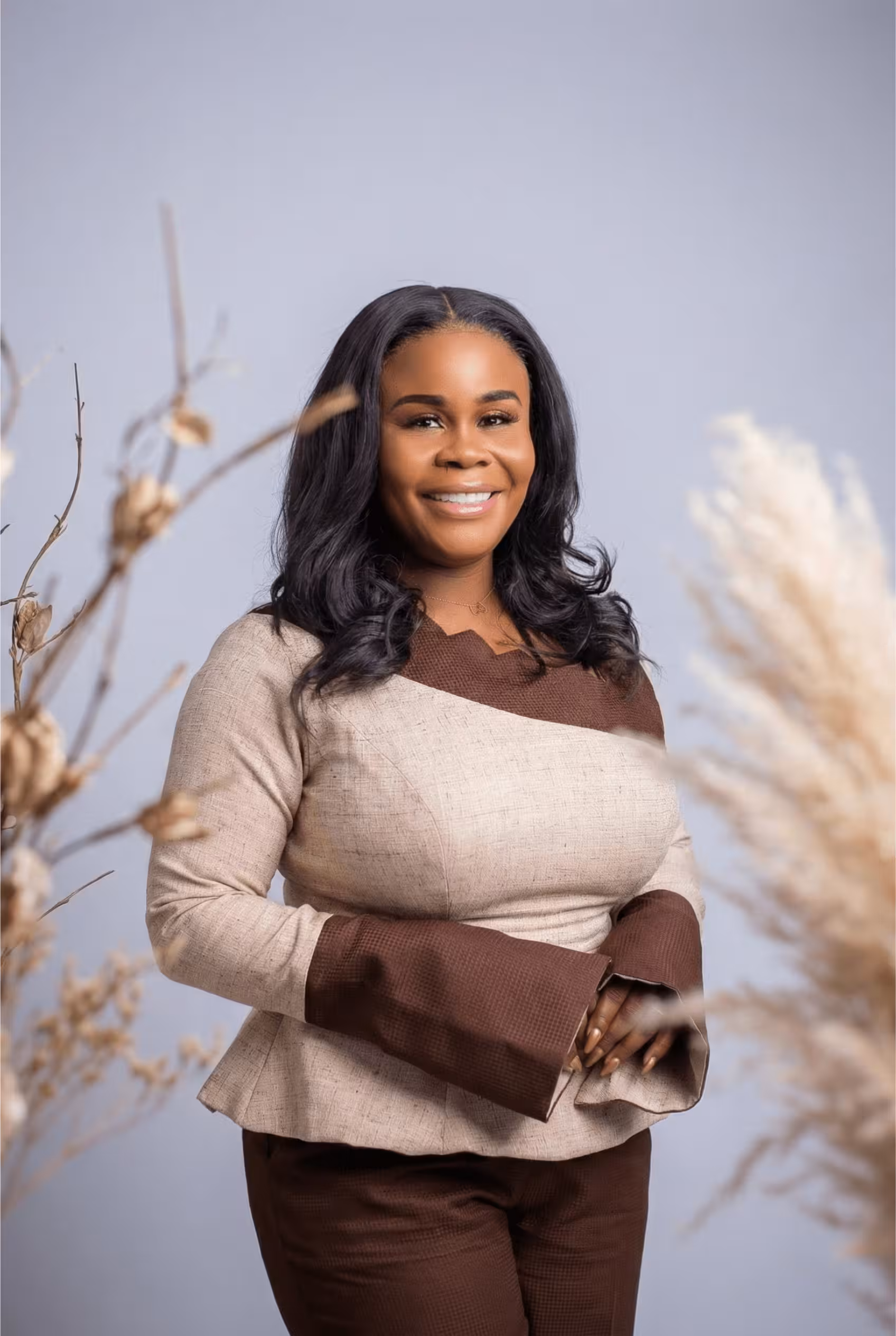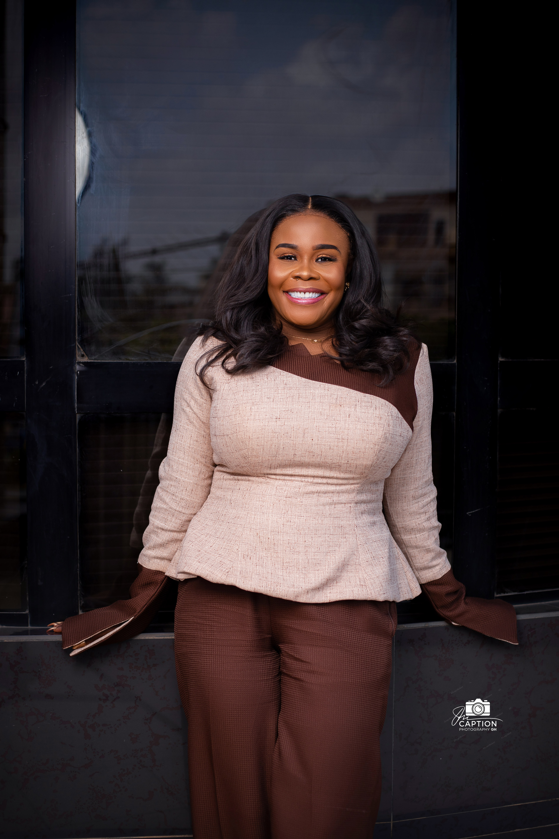 Modern art meets wearable fashion in this sophisticated beige and chocolate brown ensemble. This set plays with geometry and earth tones to create a look that is both grounded and avant-garde.